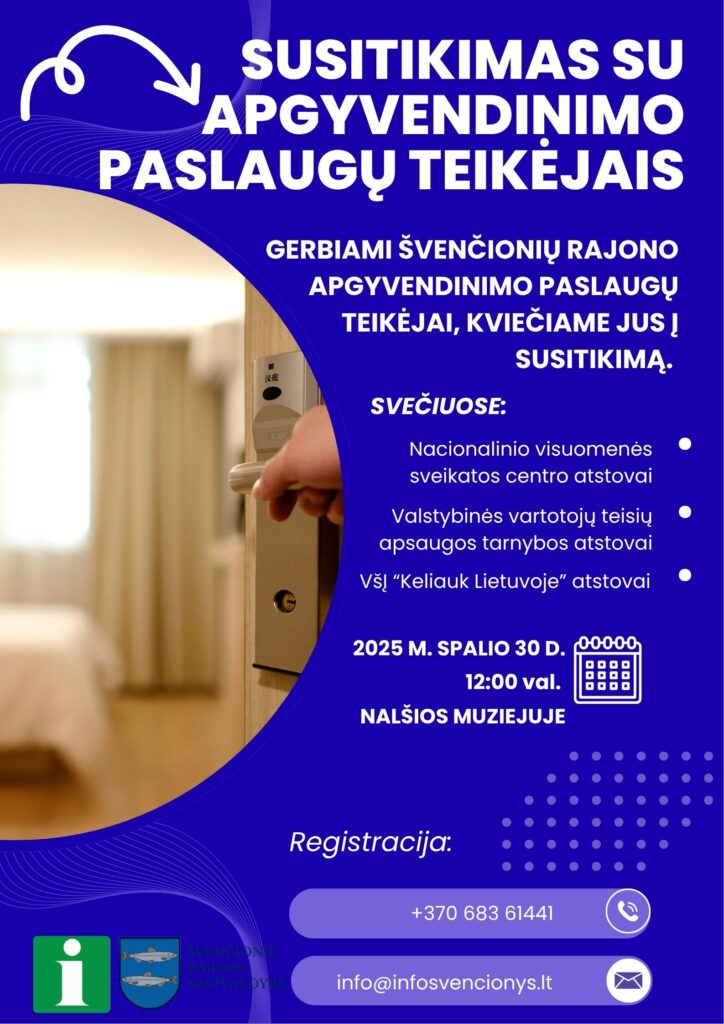2025 m. spalio 30 d. 12 val. Nalšios muziejuje vyks susitikimas, skirtas Švenčionių rajono apgyvendinimo paslaugų teikėjams. Renginio metu bus aptariamos aktualijos, iššūkiai ir galimybės turizmo srityje, taip pat pristatomi naujausi pokyčiai bei reikalavimai, susiję su šia veiklos sritimi.