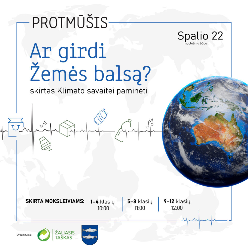 Pakuočių atliekų tvarkymo organizacija „Žaliasis taškas“ kartu su Švenčionių rajono savivaldybe kviečia Švenčionių rajono mokinius dalyvauti nemokamame aplinkosauginiame protmūšyje „Ar girdi žemės balsą?“, skirtame paminėti Klimato savaitę.
